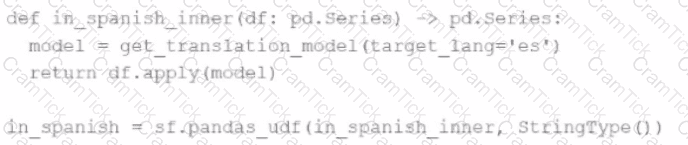 An MLOps engineer is building a Pandas UDF that applies a language model that translates English strings into Spanish. The initial code is loading the model on every call to the UDF, which is hurting the performance of the data pipeline.