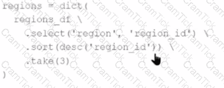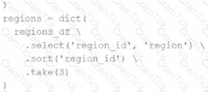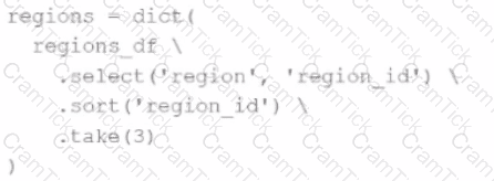 The resulting Python dictionary must contain a mapping of region -> region id containing the smallest 3 region_id values.