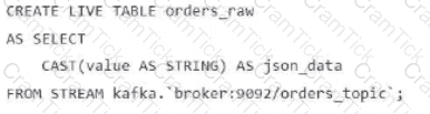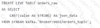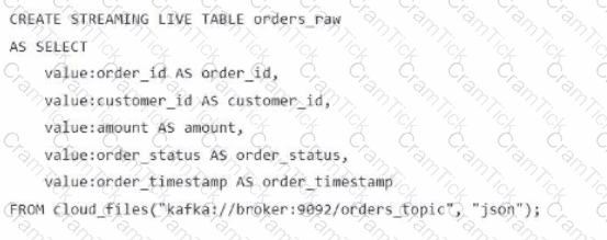A data engineer streams customer orders into a Kafka topic (orders_topic) and is currently writing the ingestion script of a DLT pipeline. The data engineer needs to ingest the data from Kafka brokers to DLT using Databricks