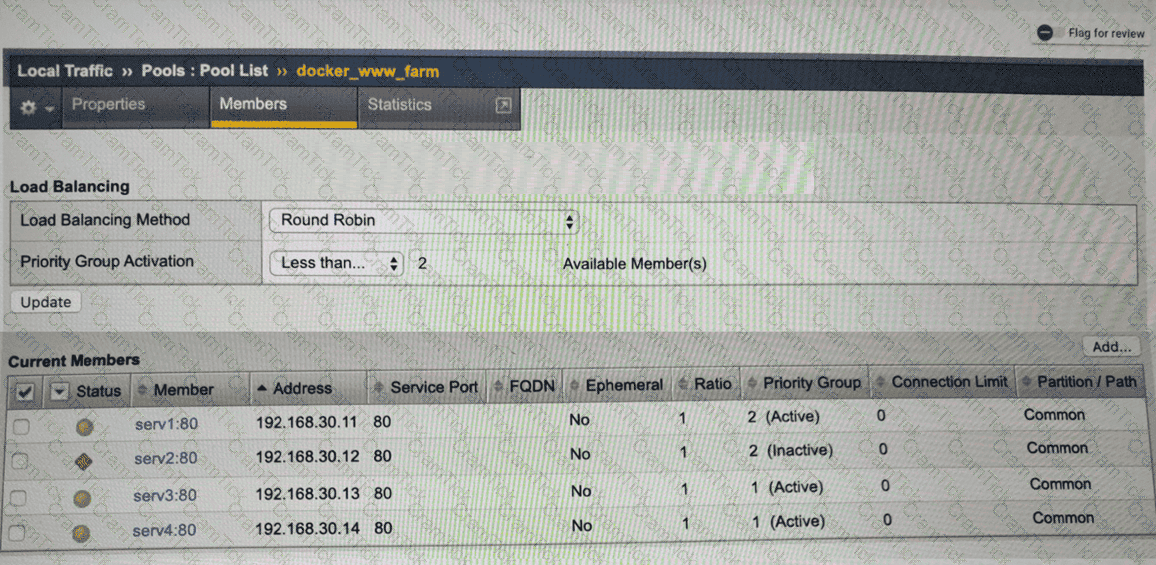 A BIG-IP pool is configured withPriority Group Activation = Less than 2 available members. The pool members have different priority groups and availability states. Which pool members arereceiving traffic? (Choose one answer)