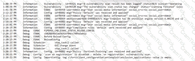 Based on the FortiClient logs shown in the exhibit, which endpoint profile policy is currently applied lo the ForliClient endpoint from the EMS server?