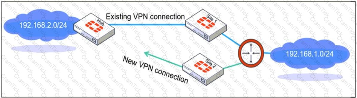 Refer to the exhibit, which shows a network diagram showing the addition of site 2 with an overlapping network segment to the existing VPN IPsec connection between the hub and site 1.