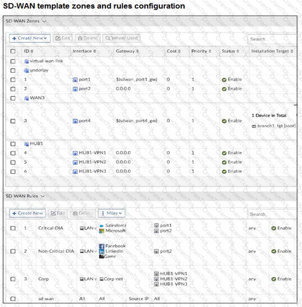 The FortiGate devices are managed by ForliManager, and are configured for direct internet access (DIA). You confirm that DIA is working as expected for each branch, and check the SD-WAN zone configuration and firewall policies shown in the exhibits.
