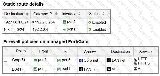 The interface details, static route configuration, and firewall policies on the managed FortiGate device are shown.
