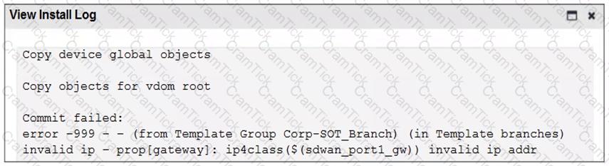 When you install the device settings, FortiManager prompts you with the error “Copy Failed” for the device branch1_fgt. When you click the log button, FortiManager displays the message shown in the exhibit.