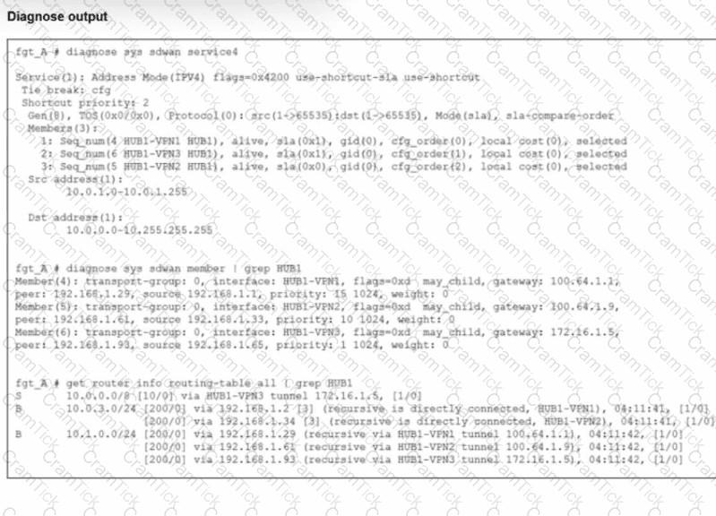 An administrator is troubleshooting SD-WAN on FortiGate. A device behind branch1_fgt generates traffic to the 10.0.0.0/8 network.