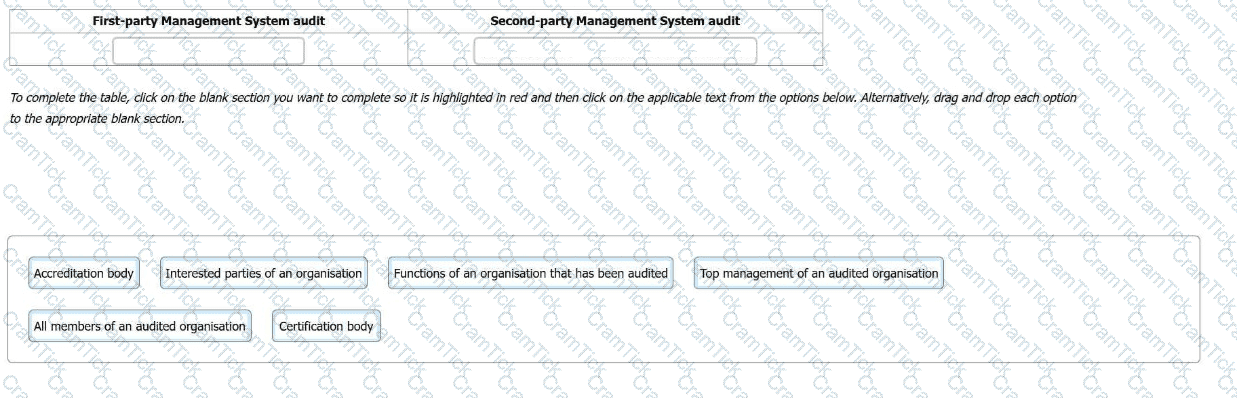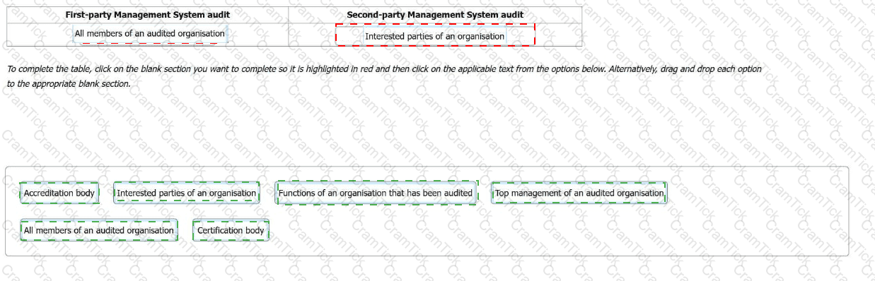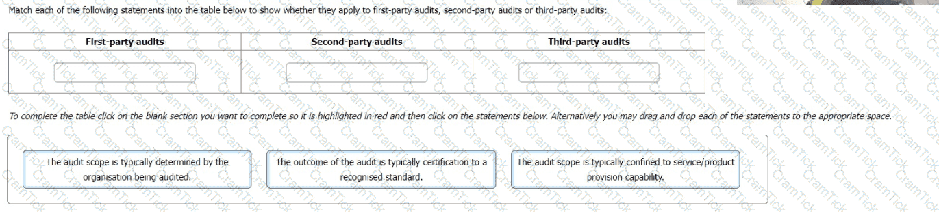 Match each of the following statements into the table below to show whether they apply to first-party audits, second-party audits or third-party audits: