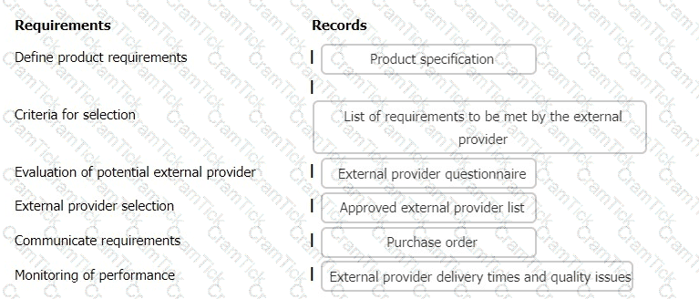 The following list gives examples of records that may be evidence of how an organisation has fulfilled the requirements of clause 8.4 of ISO 9001. Match the records to the appropriate requirement of clause 8.4.
