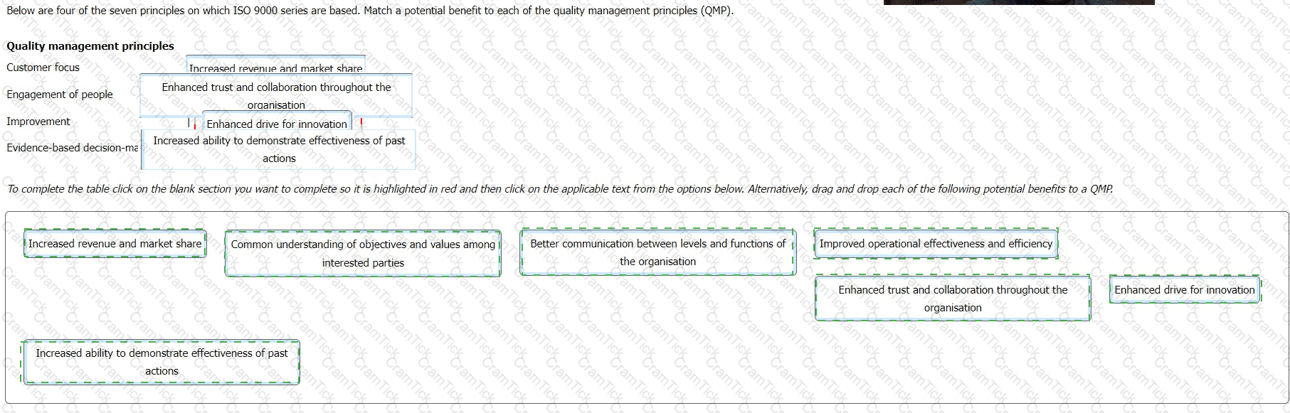 Below are four of the seven principles on which ISO 9000 series are based. Match a potential benefit to each of the quality management principles (QMP).