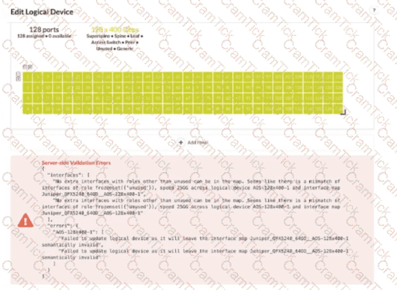 You are using Juniper Apstra to create logical devices and interface maps. You use them in three different rack types. You then modify the logical devices to support the required increased interface speeds and receive an error message when updating the logical devices.