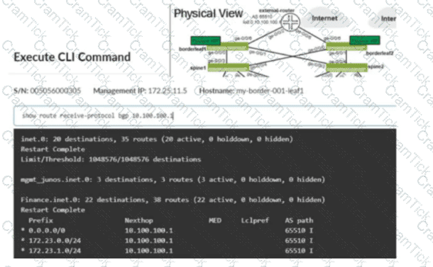 The same connectivity template is applied to the ge-0/0/6 interface on both borderleaf1 and borderleaf2 nodes. This connectivity template describes the intended configuration of the eBGP session between each of the borderleaf nodes and the external router. You want to ensure that the 172.23.x/24 routes are not installed in the borderleaf nodes’ Finance routing table.