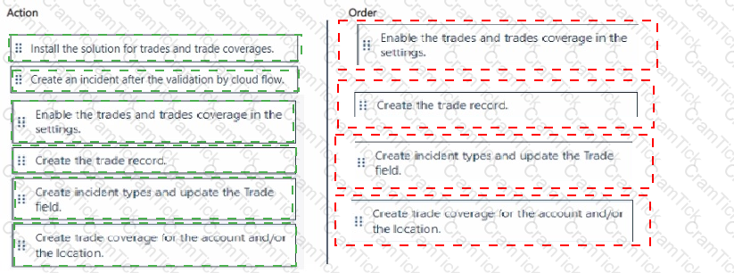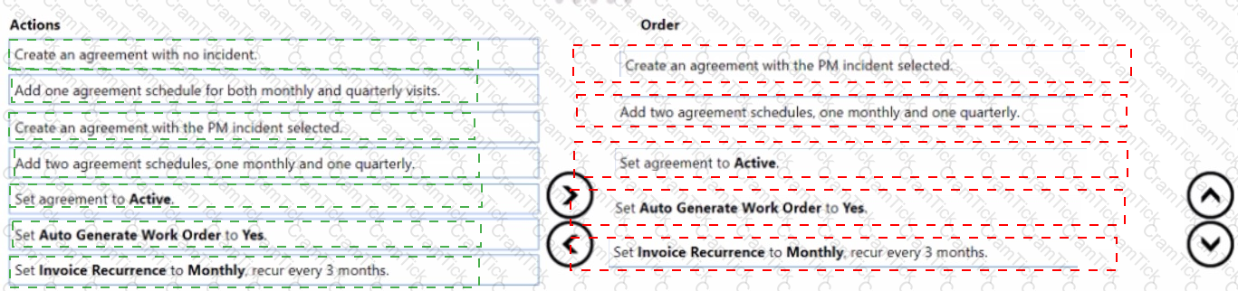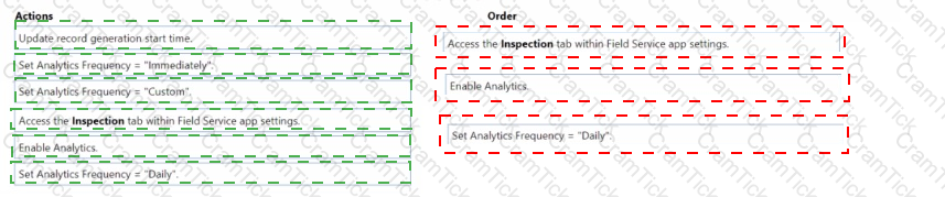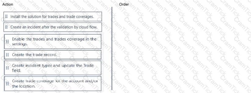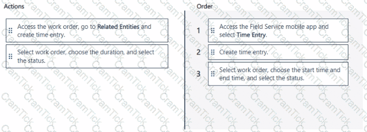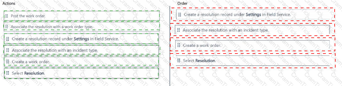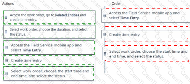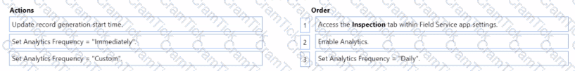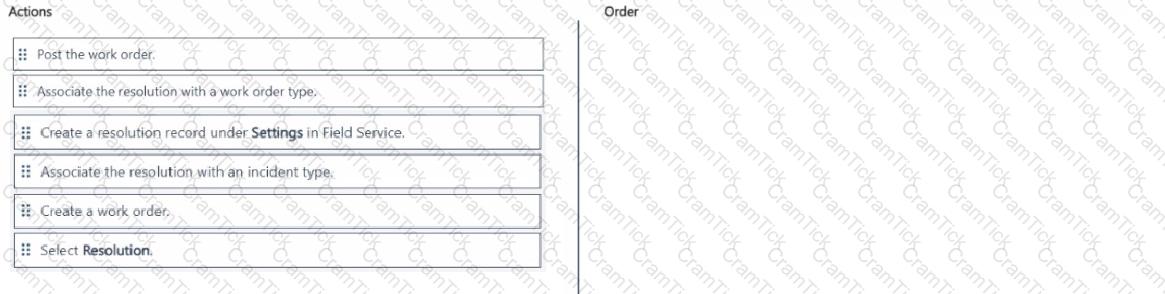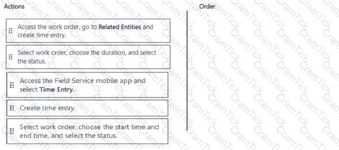 Which three actions should you perform in sequence in the Field Service app? To answer, move the three appropriate actions from the list of actions to the answer area. Arrange the three actions in the order.