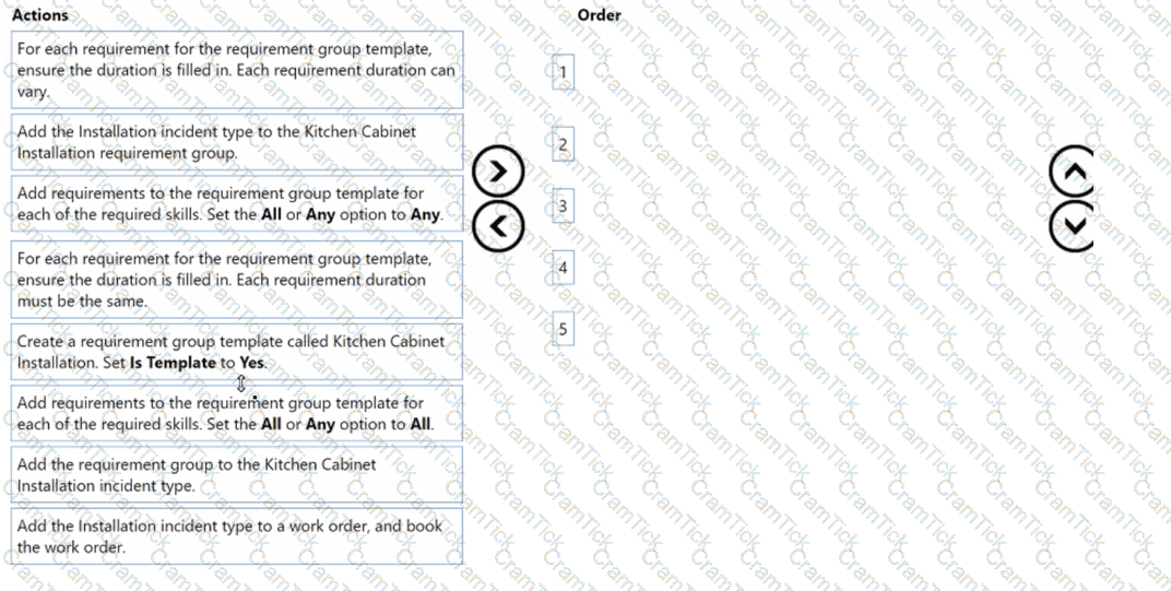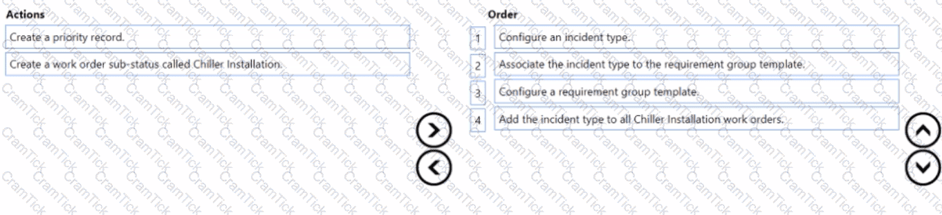 You need to configure the functionality necessary to automatically add all the tasks and resources needed to a work order when the work order type is Chiller Installation. You must follow the established Contoso guidelines for installation requirements, as outlined in the Case Study, and create the most efficient process possible.