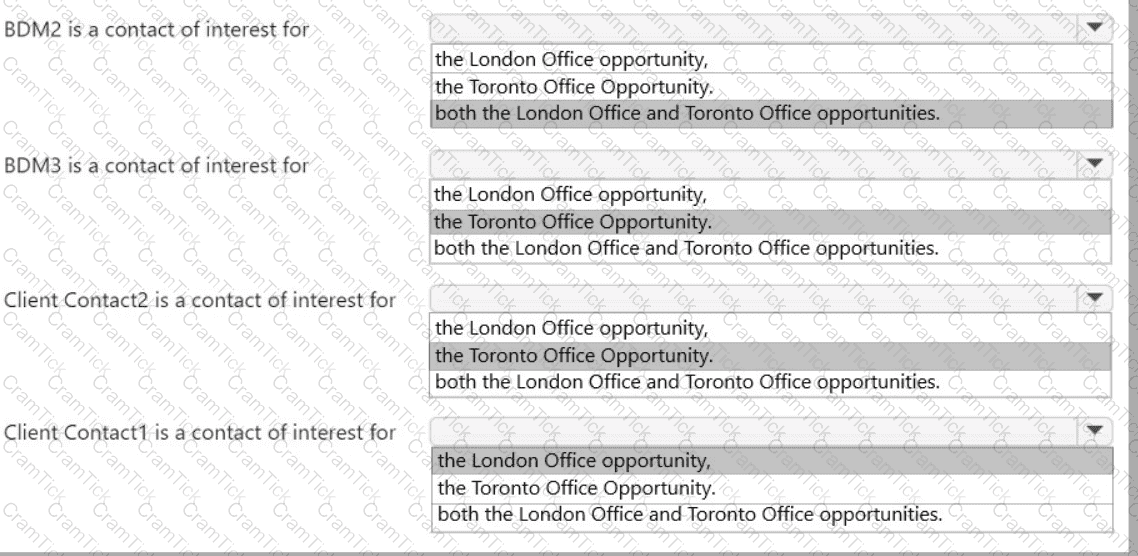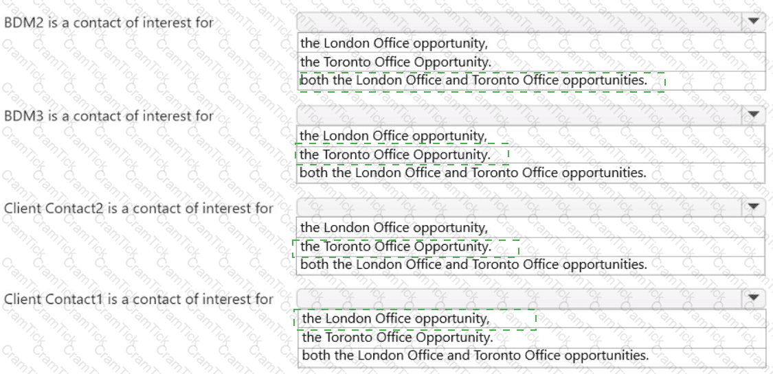 You need to help BDM3 understand which internal and external contacts are considered contacts of interest for relationship analytics KPI calculations for the two opportunities shown in the following exhibit.