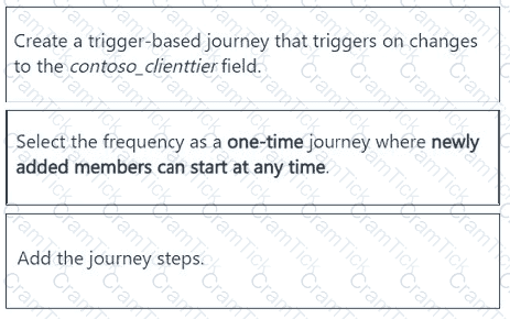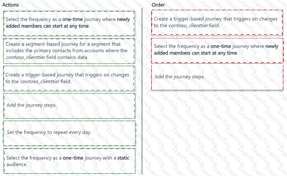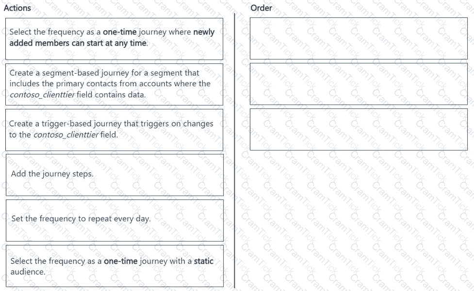 Which three actions should you perform in sequence before you publish the journey? To answer, move the three appropriate actions from the list of actions to the answer area. Arrange the three actions in the correct order.