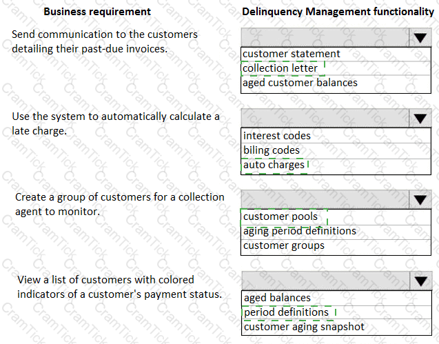 You need to associate the correct system functionality to manage delinquent customers based on these business requirements.