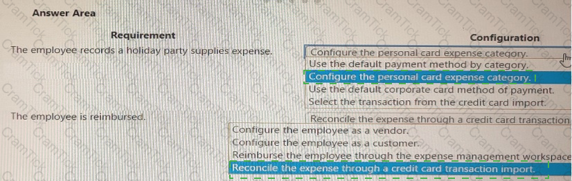 How should you configure the expense module? To answer, select the appropriate options in the answer area.