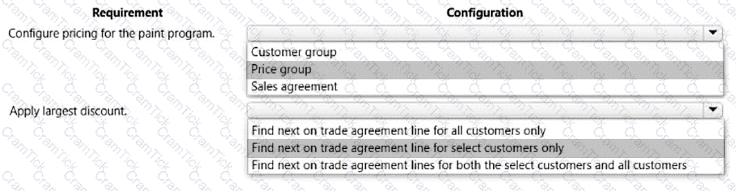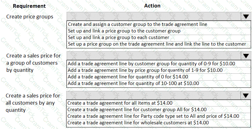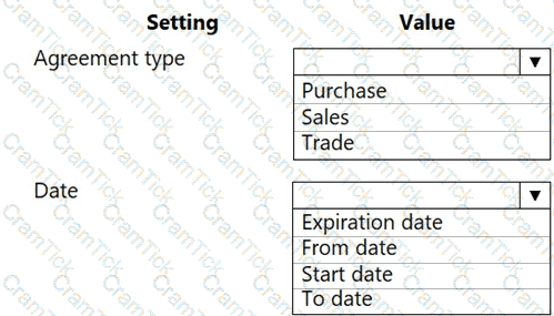 In Trade Agreement Setup, which actions should you perform? To answer, select the appropriate options in the answer area.