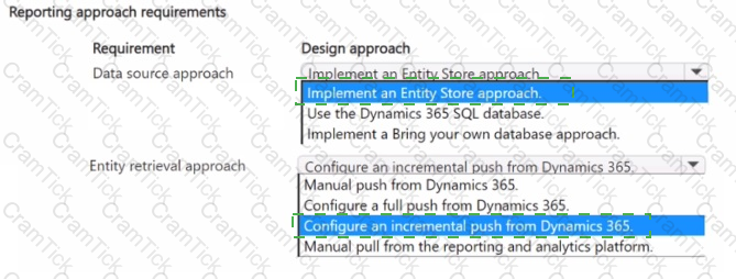 Which design approach should you use for each requirement? To answer, select the appropriate options in the answer area.