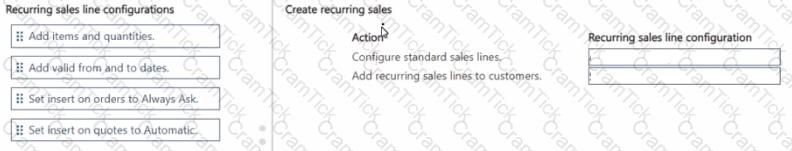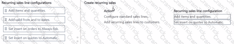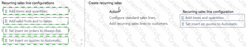 How should you complete each action? To answer, move the appropriate recurring sales line configurations to the correct actions. You may use each recurring sales line configuration once, more than once, or not at all. You may need to move the split bar between panes or scroll to view content.