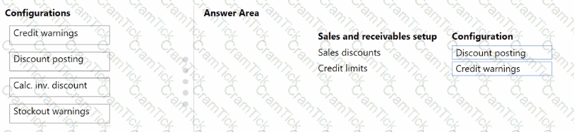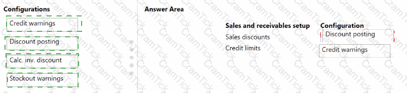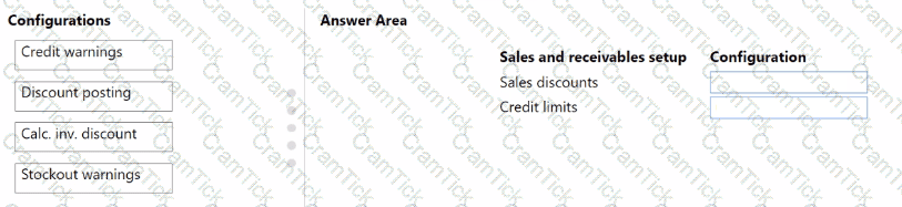 What should you configure for each setup area? To answer, drag the appropriate configurations to the correct sales and receivables setup. Each configuration may be used once, more than once, or not at all. You may need to drag the split bar between panes or scroll to view content.
