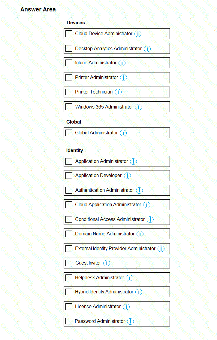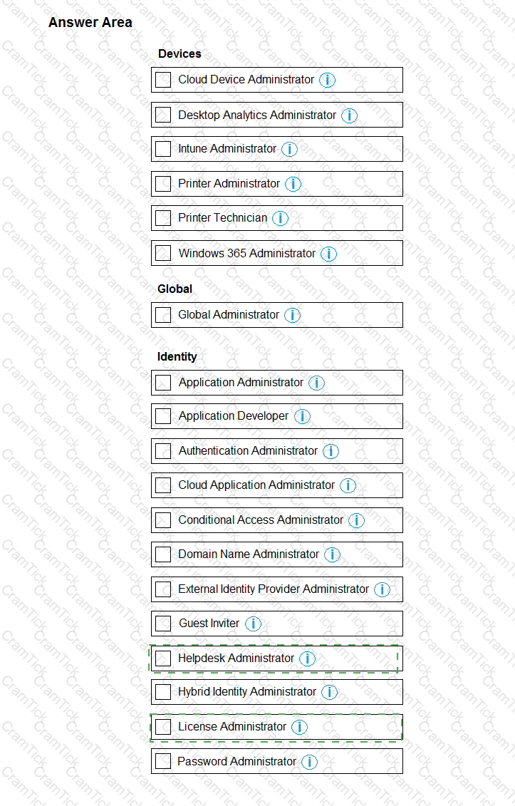 You need to assign roles to Admin1 to meet the requirements. The solution must use the principle of least privilege. Which two roles should you assign? To answer, select the appropriate roles in the answer area.