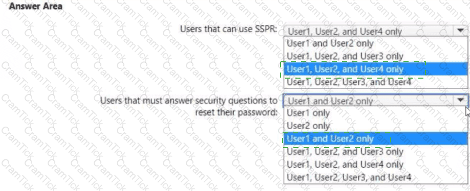 Which users can use SSPR, and which users must answer security questions to reset their password? To answer, select the appropriate options in the answer area.