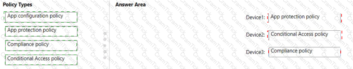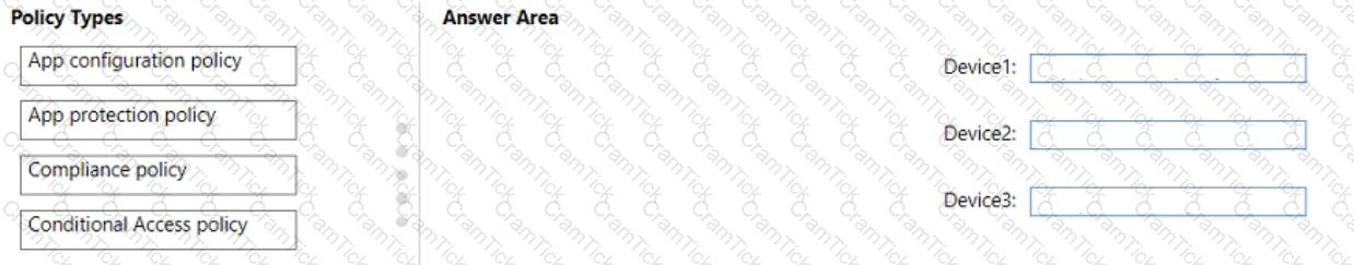 Which type of polio/ should you configure for each device? To answer, drag the appropriate policy types to the correct devices. Each policy type may be used once, more than once, or not at all. You may need to drag the split bar between panes or scroll to view content.