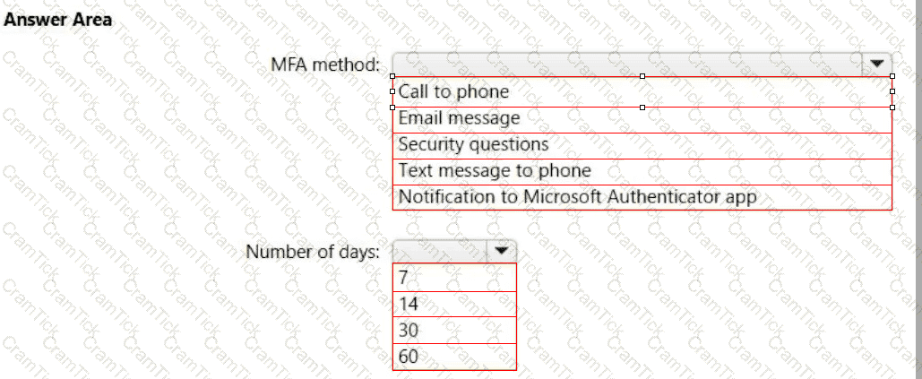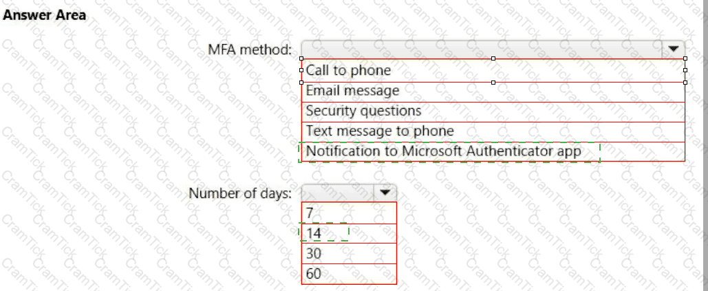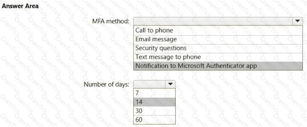 Which multi-factor authentication (MFA) method can the user use, and how many days does the user have to register for MFA? To answer, select the appropriate options in the answer area.