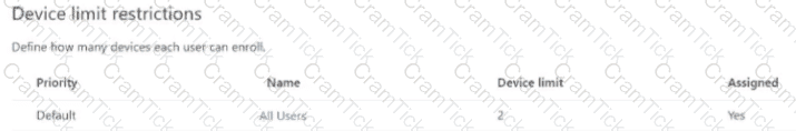 In Microsoft Endpoint Manager, the Device limit restrictions are configured as shown in the following exhibit.