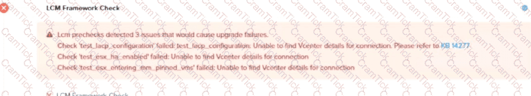 Check test lacp_configuration' failed: test_lacp_configuration: Unable to find Vcenter details for connection. Please refer to KB 14277 Check test esx_ha_enabled' failed: Unable to find Vcenter details for connection
