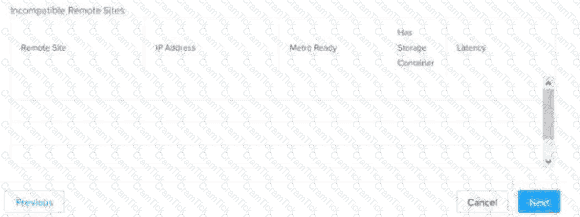 An administrator is trying toconfigure Metro Availabilitybetween NutanixESXi-based clusters. However, theCompatible Remote Sitesscreen does not list all required storage containers.