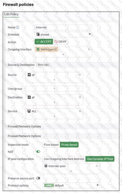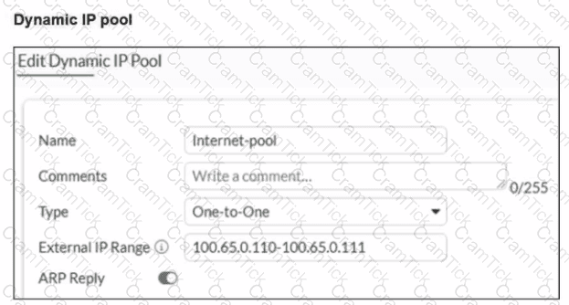 A diagram of a FortiGate device connected to the network, as well as the firewall policy and IP pool configuration on the FortiGate device are shown.