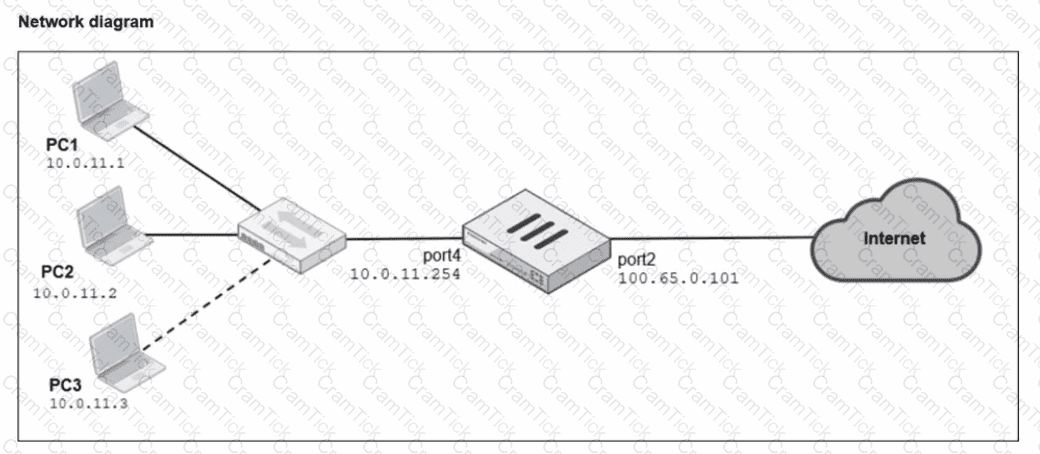 Two PCs. PC1 and PC2, are connected behind FortiGate and can access the internet successfully. However, when the administrator adds a third PC to the network (PC3), the PC cannot connect to the internet.