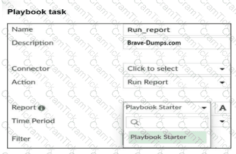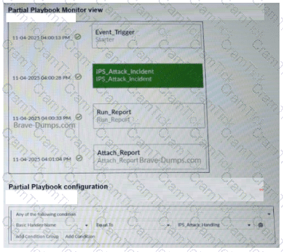 A partial view of the Playbook Monitor page and the corresponding playbook configuration are shown. Based on the monitor page and the configuration of the playbook, what has triggered the Run_Report task? (Choose one answer)