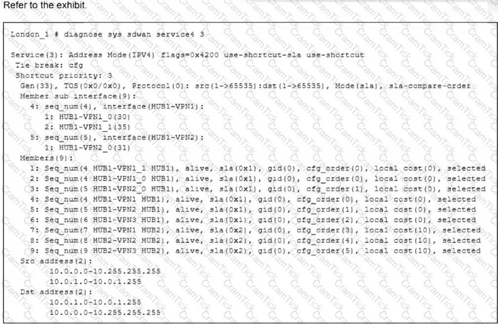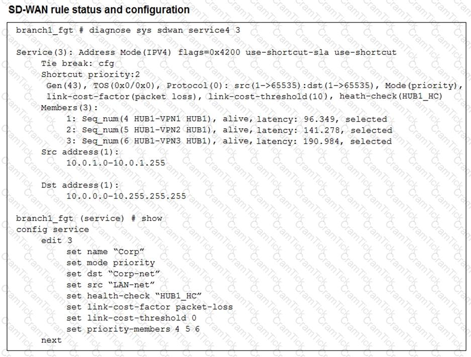 (Refer to the exhibits. You collected the output shown in the exhibits and want to know which interface TCP traffic will flow through from the user device 10.0.1.101 to the corporate file server 10.0.0.125. All SD-WAN links are stable.