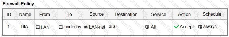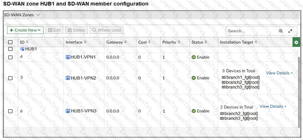 The FortiGate devices are managed by ForliManager, and are configured for direct internet access (DIA). You confirm that DIA is working as expected for each branch, and check the SD-WAN zone configuration and firewall policies shown in the exhibits.