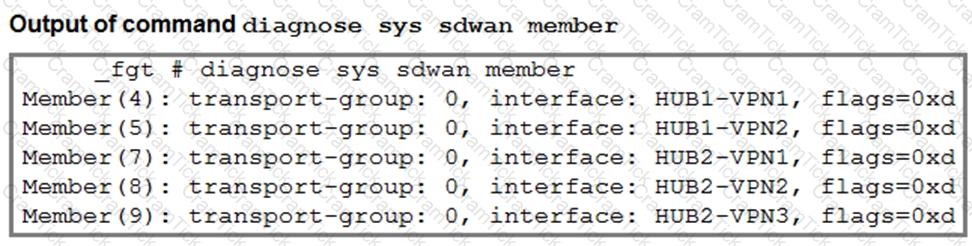 The first exhibit shows the SD-WAN zone HUB1 and SD-WAN member configuration from an SD-WAN template, and the second exhibit shows the output of command diagnose sys sdwan member collected on a FortiGate device.