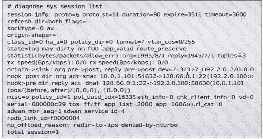 (Refer to the exhibit. You noticed that one SD-WAN member went down and you immediately collected the session output shown in the exhibit. What can you conclude from this output? Choose one answer.)