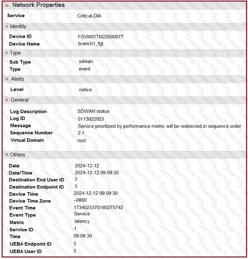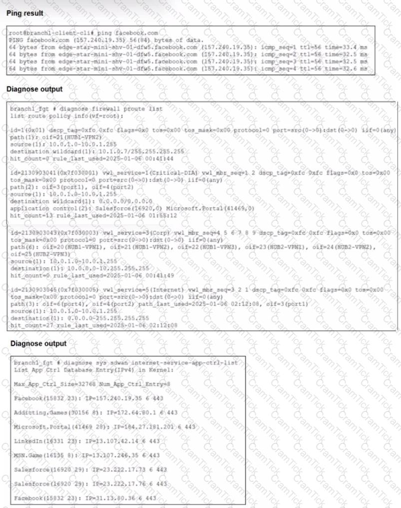 An administrator is testing application steering in SD-WAN. Before generating test traffic, the administrator collected the information shown in the first exhibit. After generating GoToMeeting test traffic, the administrator examined the corresponding traffic log on FortiAnalyzer, which is shown in the second exhibit.