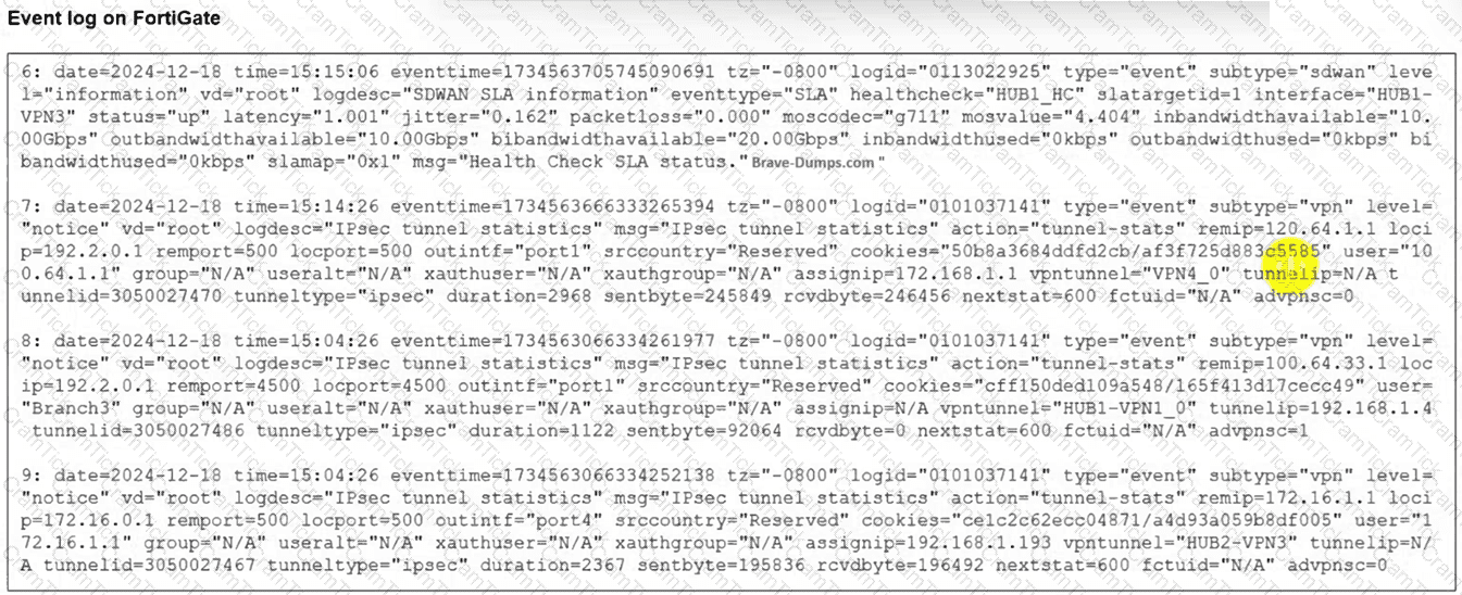 The event log on a FortiGate device is shown.