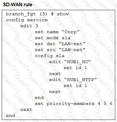 Refer to the exhibits, which show the configuration of an SD-WAN rule and the corresponding rule status and routing table.