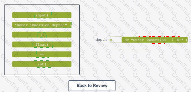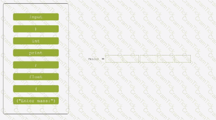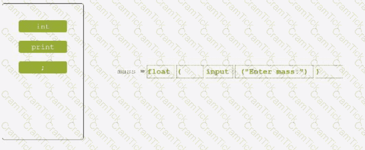 Insert the code boxes in the correct positions in order to build a line of code which asks the user for a float value and assigns it to the mass variable.