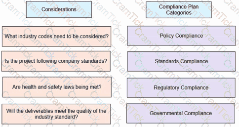 A project manager is leading a project in a heavily regulated industry. Match the considerations on the left with the correct compliance plan categories on the right.