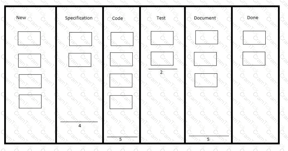 A project manager receives an update that the development flow is not going well. Some team members cannot start their work because the delivery is late. Looking at the Kanban board and the work in progress (WIP) lines, the project manager observes a bottleneck.