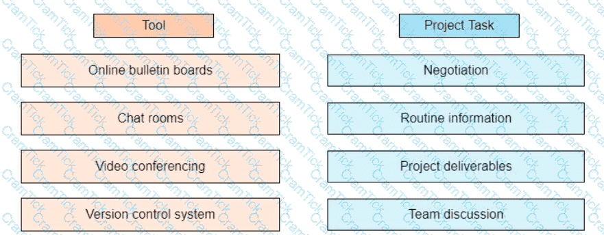 An agile team is geographically separated across multiple continents, and the project manager of identifying the tools to manage the communication among the virtual teams Drag the appropriate tool on the left to each project task on the right