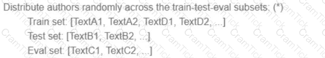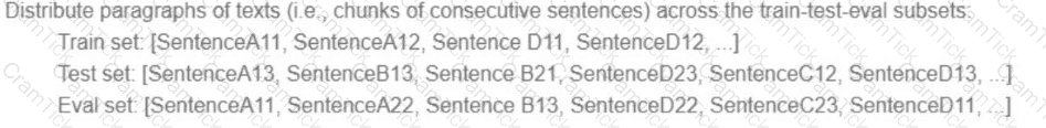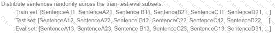 You followed the standard 80%-10%-10% data distribution across the training, testing, and evaluation subsets. How should you distribute the training examples across the train-test-eval subsets while maintaining the 80-10-10 proportion?