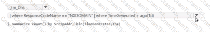 You need to query the ASIM DNS schema to list all the DNS events from the last 24 hours that have a response code of 'NXDOMAIN' and were aggregated by the source IP address in 15-minute intervals. The solution must maximize query performance.