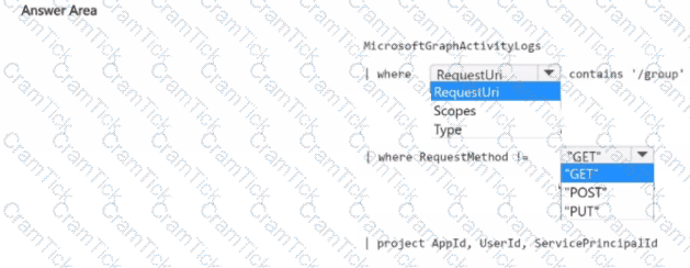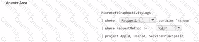You need to identify all the security principals that submitted requests to change or delete groups. How should you complete the KQL query? To answer, select the appropriate options in the answer area.