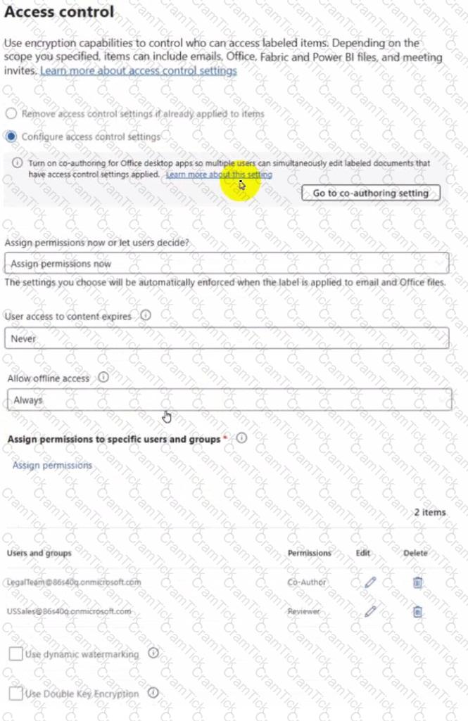 The Access control settings for the sensitivity label are configured as shown in the exhibit (Click the Exhibit tab.)